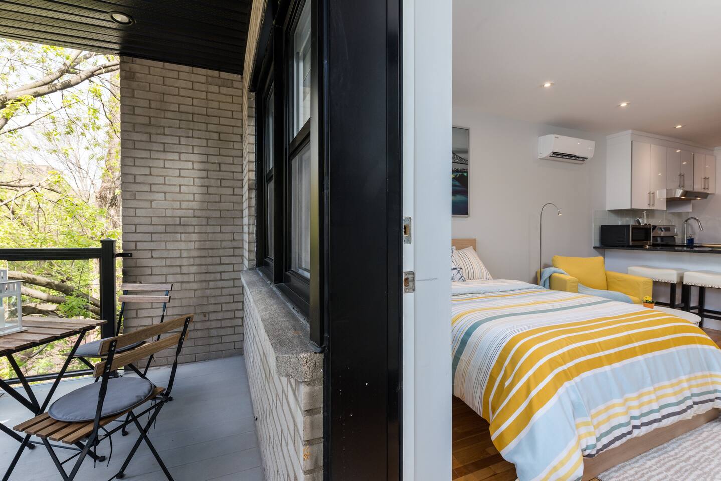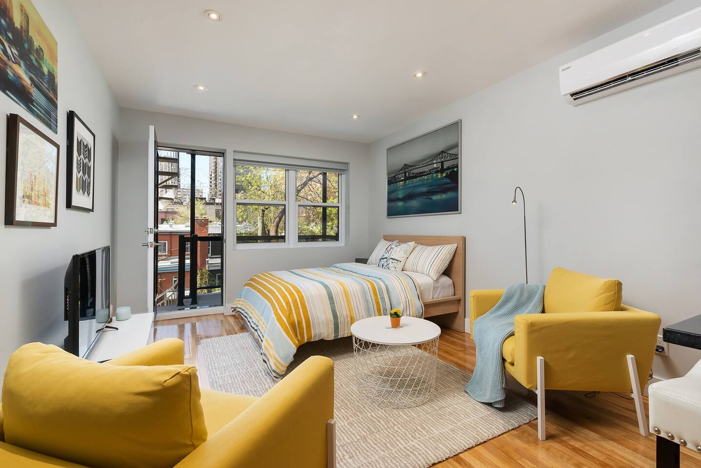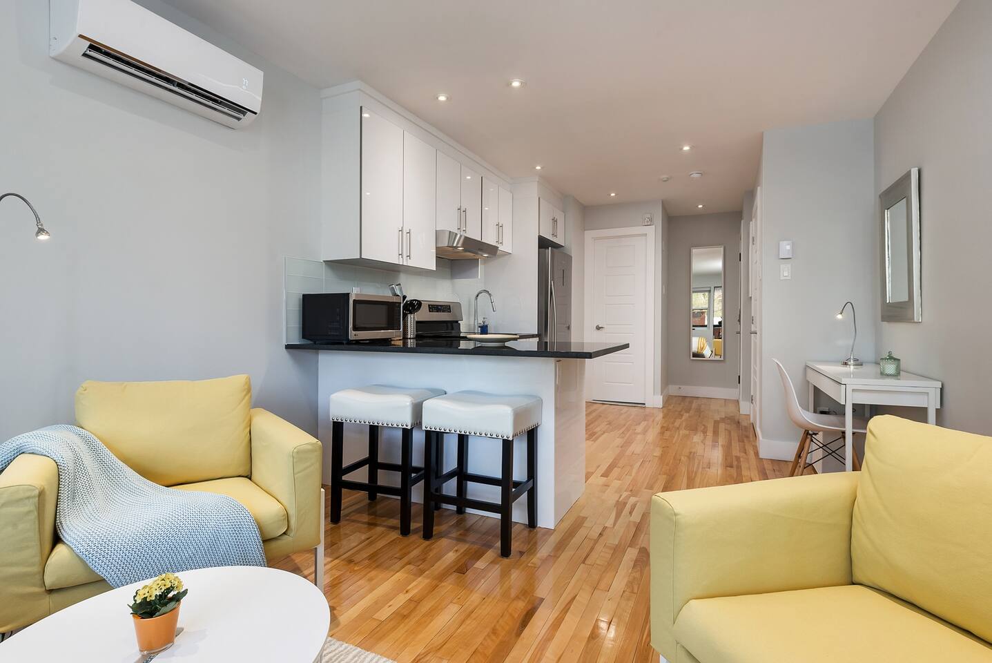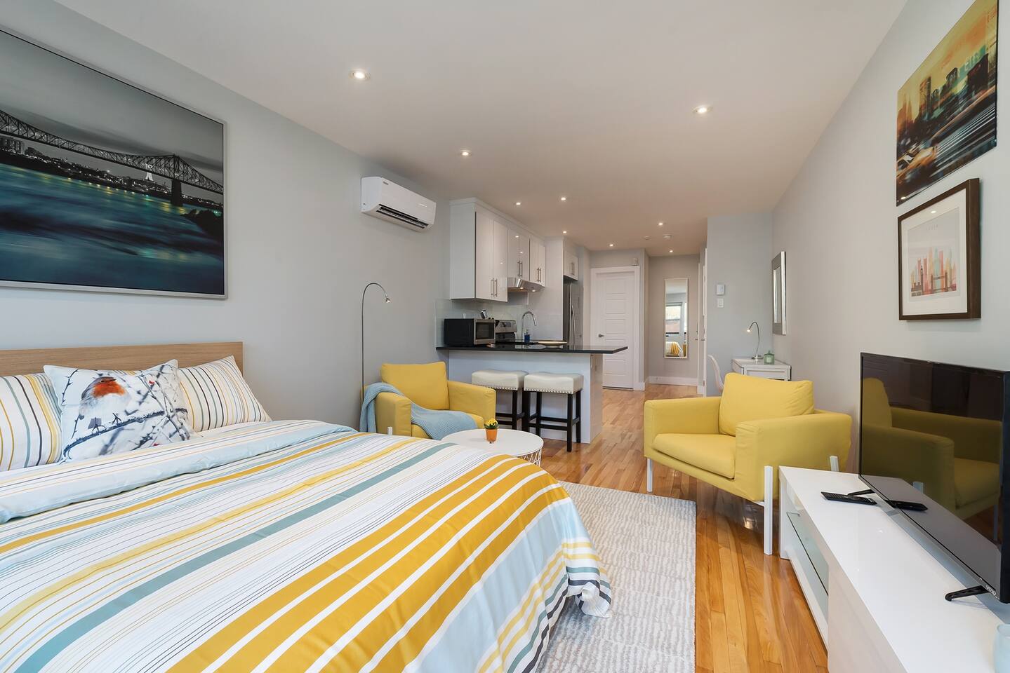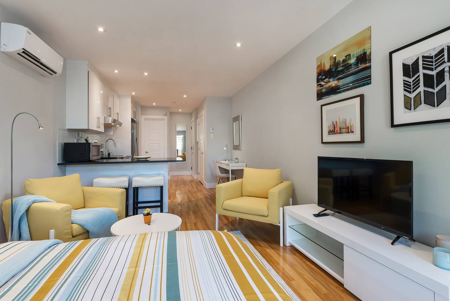 Welcome to your urban retreat in Montreal! Our cozy and modern 1-bed, 1-bath suite at Rue Clark is the ideal haven for solo travelers, couples, small groups, and business travelers alike. Conveniently located in the lively Plateau-Mont-Royal neighborhood, you're just steps away from Montreal's best attractions. Living Room: Step into a cozy, spacious, and inviting living room where you'll instantly feel at home. The perfect spot to unwind after a day of exploration or business meetings, the living room offers a relaxing ambiance for everyone. Bedroom: Enjoy a restful night's sleep on the comfortable double-sized bed. The modern and well-appointed bedroom is designed to cater to the needs of solo adventurers, couples, and small groups, ensuring a comfortable and memorable stay. Closet: Pack light! Our apartment features a spacious closet to accommodate your wardrobe, making it easy to keep your living space tidy and organized throughout your stay. Extras: No need to worry about linens and towels—we provide full sets for the bed and enough towels for everyone. Enjoy the convenience of a well-prepared space so you can focus on making the most of your Montreal experience. Bathroom: The bathroom boasts a sleek design and includes a shower, providing a refreshing start or end to your day. Washer and Dryer: For your convenience, a shared washer and dryer are available in the building. Keep your clothes fresh and clean during your stay without the hassle of finding a laundromat. Internet: Stay connected with high-speed Wi-Fi included in the unit. Plus, unwind with your favorite shows and movies on Netflix after a day of exploring the city. Parking: Parking is a breeze with several paid and free options close by. Contact us in advance if you prefer paid parking, and we'll help you secure a spot for a worry-free stay. Book your stay for a delightful Montreal experience, where comfort, convenience, and style come together seamlessly. We look forward to hosting you! Cozy, spacious and inviting, you’ll feel perfectly at home in this modern 1 bed, 1 bathroom suite. Perfect for the solo traveler, couples, small groups, and those in town for business. The apartment has a spacious closet, Double sized bed. The kitchen and living room area are fully equipped with everything you need to eat and relax after a long day sightseeing or working. The living room includes two comfy chairs to help you unwind while you watch our complimentary Netflix on the HD TV . I have full sets of linens for the bed as well as towels for everyone - so you don't have to worry about that! The bathroom includes a shower and a shared washer & dryer are also located in the building for guests to use. High speed wifi is included in the unit as well as Netflix. There are several paid or free parking options close by. Looking forward to hosting you!!